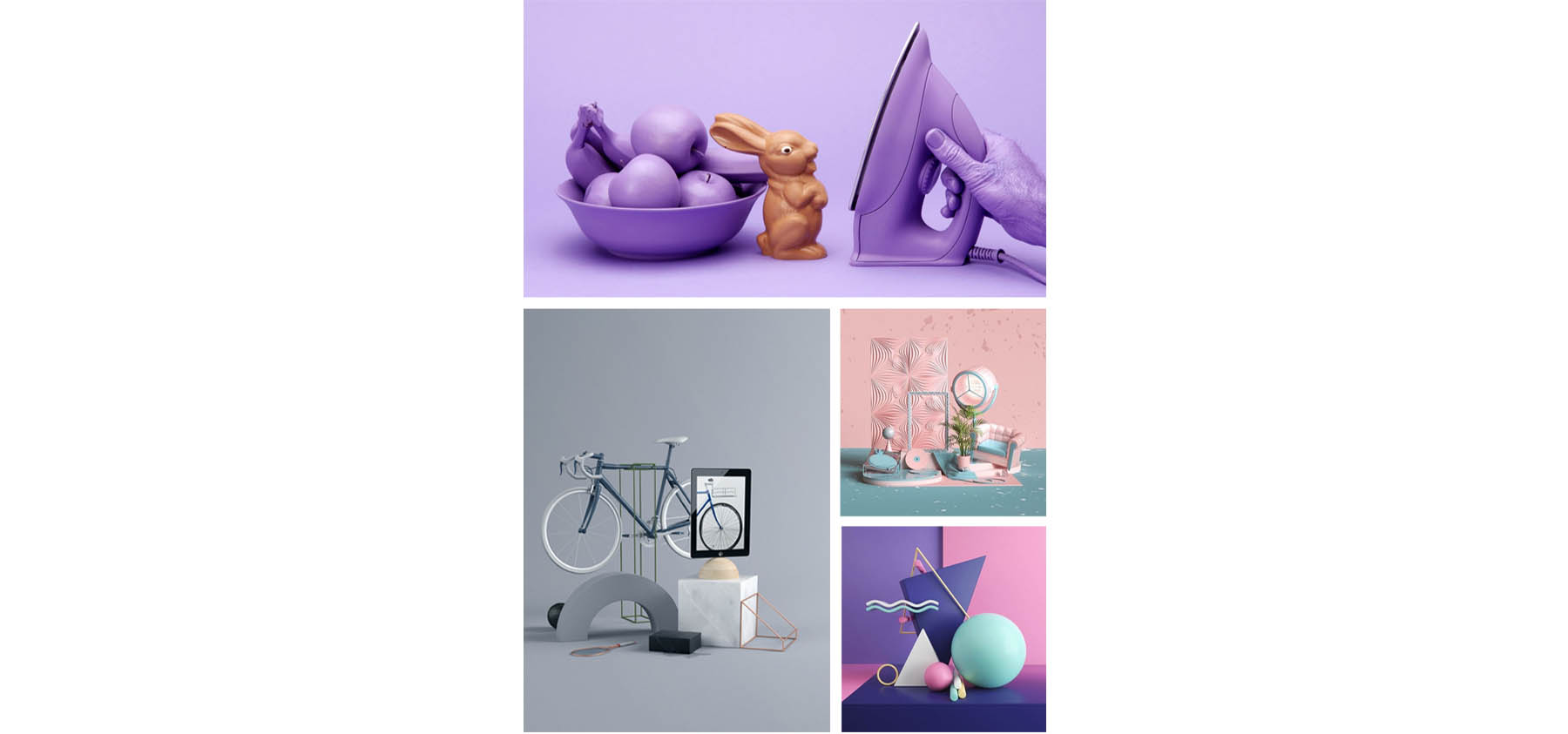 空间感的布局拓展了画面深度,同时物体纯色系的渲染方式又强化了画面的平面感。